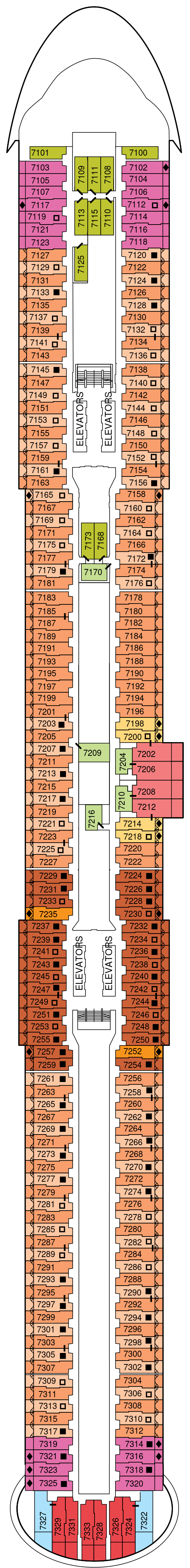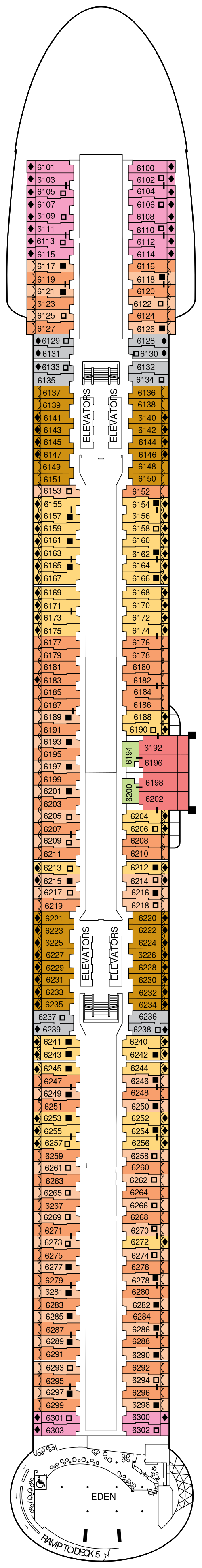 船体の片側に大きく突き出た可動式オープンデッキ「マジックカーペット」をはじめ、多彩な楽しみ方ができるオープンデッキ「ルーフトップガーデン」、洋上のバカンスを体現した開放的なラウンジ「エデン」、高貴な邸宅をイメージさせる客室の数々、スイート客室専用のオープンデッキなど、更に進化を遂げたモダンでラグジュアリーな体験をご提供いたします。