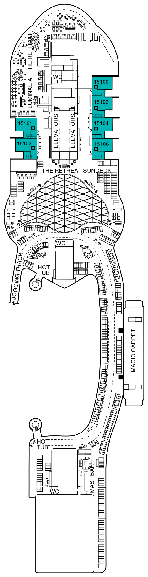 スイートクラスのお客様のみご利用いただけるプライベート空間。屋外にはザ・リトリートサンデッキがあり、屋外プール、バーも備わり、無料で飲み物、食べ物、ライブエンターテイメントをお楽しみください。また屋内にあるザ・リトリートラウンジではコンシェルジュが常駐し、乗船中や寄港時のご要望やご質問などをご相談いただけます。