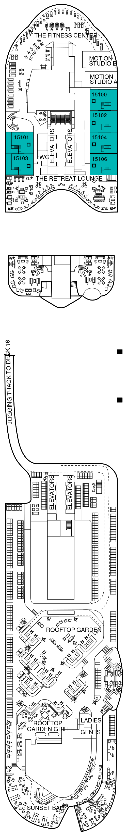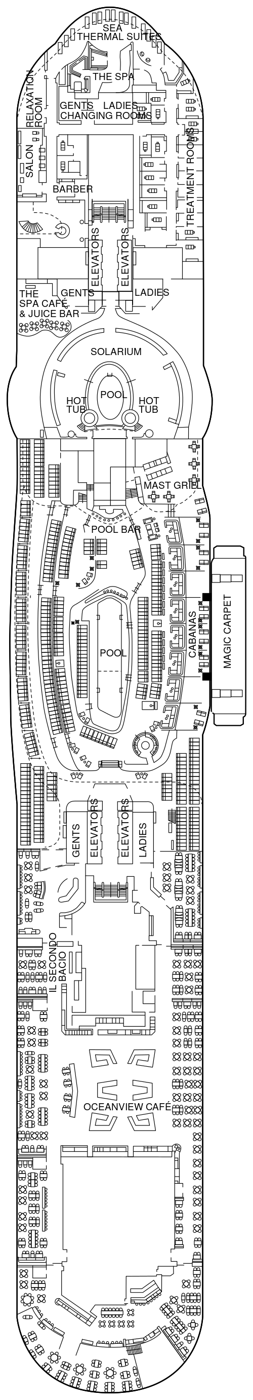 船体の片側の海に突き出た全長約30mの革新的なオープンデッキ。デッキ16からデッキ2までを上下に行き来します。日中は約100名を収容できるオープンテラスのレストランへ。夜になると、上層のデッキへ移動し、特別な夜には特別な夕食をお召上がりいただけるレストランとして利用されたり、DJによるパフォーマンスが開催されるラウンジへ変身します。さらに、テンダーボートを使用する寄港地では、デッキ2まで下がり、お客様をスムーズにテンダーボートへ乗せ込むステーションとして活躍します。