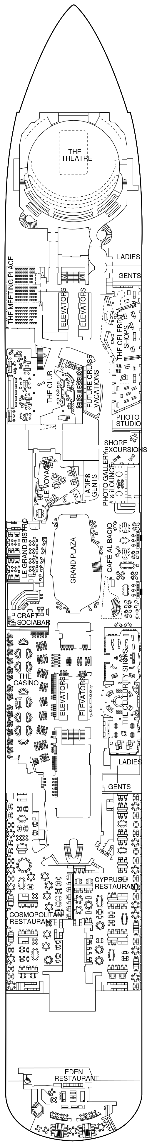 エデンは船尾に位置する3層吹き抜けのラウンジ。約650平方メートルのガラスに覆われた開放的な空間。細部までこだわり抜いたデザインは国際的に著名なデザイナーにより誕生しました。エッジクラスの客船のコンセプトでもある「洋上のバカンス」を体現した空間です。