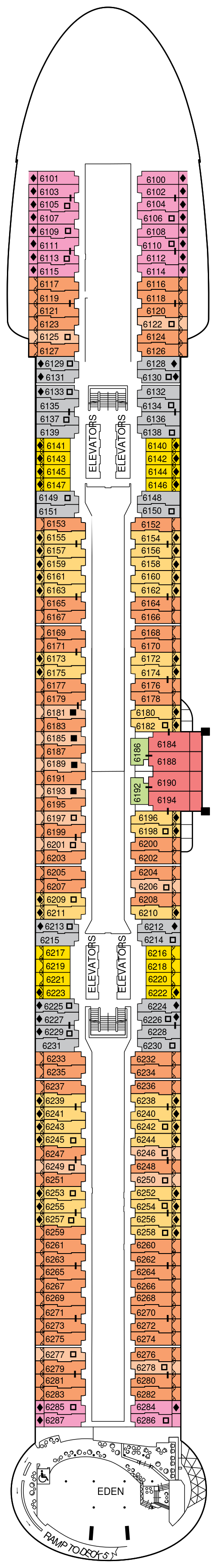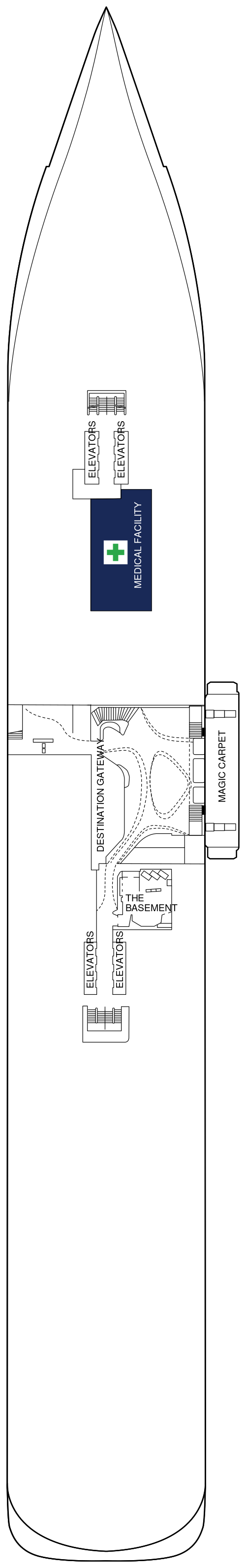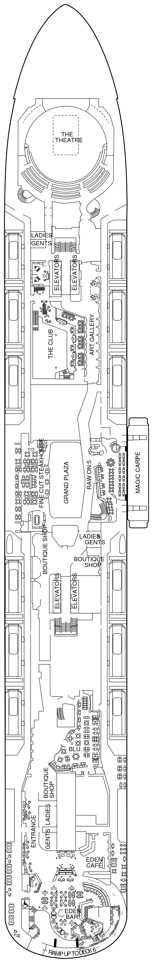 船体の片側に大きく突き出た可動式オープンデッキ「マジックカーペット」をはじめ、多彩な楽しみ方ができるオープンデッキ「ルーフトップガーデン」、洋上のバカンスを体現した開放的なラウンジ「エデン」、高貴な邸宅をイメージさせる客室の数々、スイート客室専用のオープンデッキなど、更に進化を遂げたモダンラグジュアリーな体験をご提供いたします。