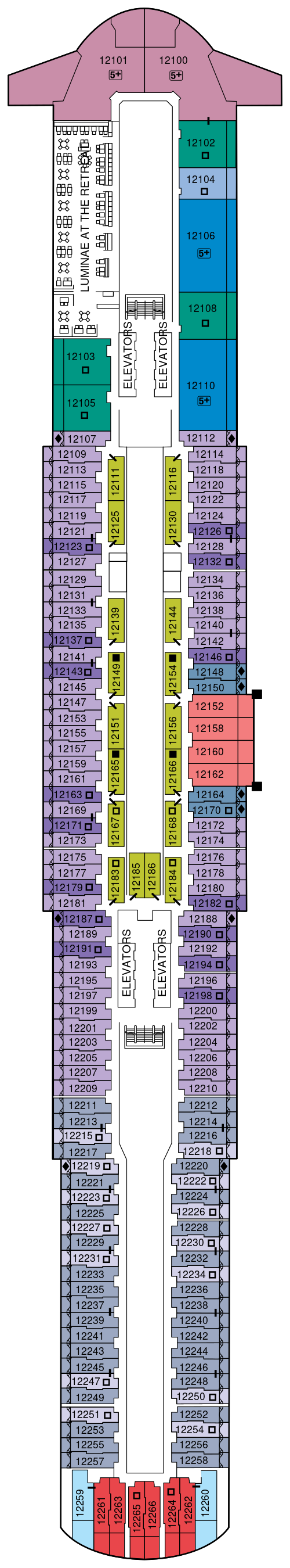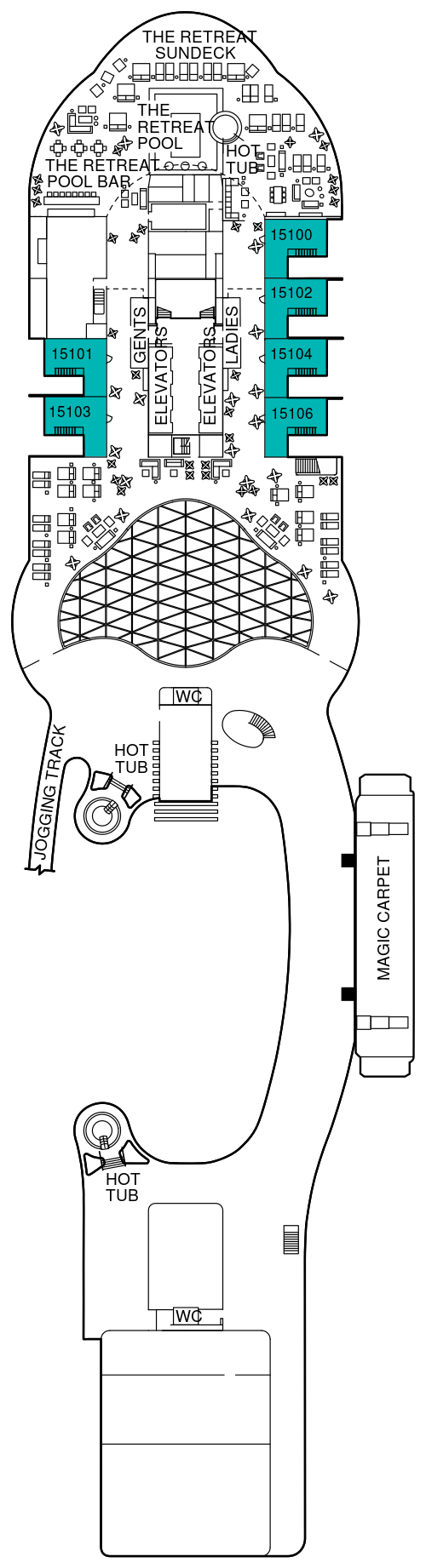 スイートクラスのお客様のみご利用いただけるプライベート空間。屋外にはザ・リトリートサンデッキがあり、屋外プール、バーも備わり、無料で飲み物、食べ物、ライブエンターテイメントをお楽しみください。また屋内にあるザ・リトリートラウンジではコンシェルジュが常駐し、乗船中や寄港時のご要望やご質問などをご相談いただけます。