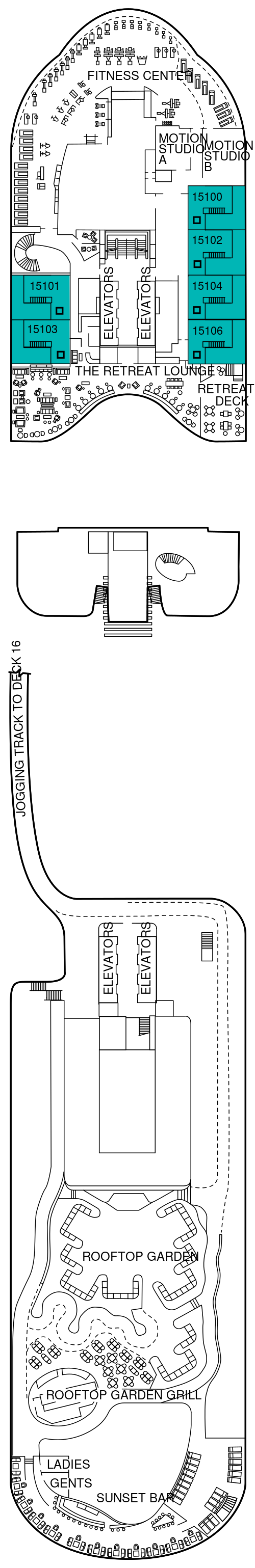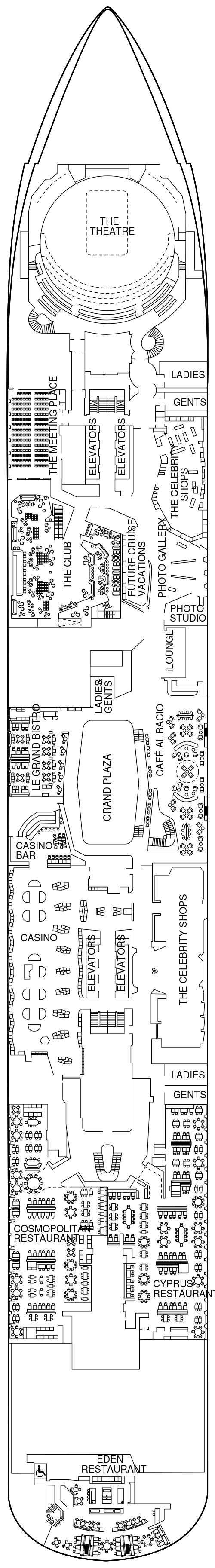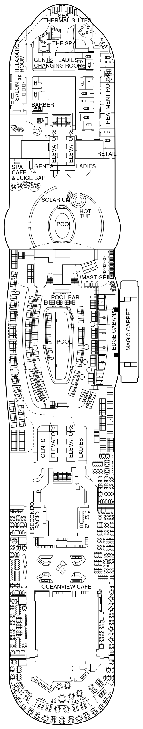 船体の片側の海に突き出た全長約30mの革新的なオープンデッキ。デッキ16からデッキ2までを上下に行き来します。日中は約100名を収容できるオープンテラスのレストランへ。夜になると、上層のデッキへ移動し、特別な夜には特別な夕食”ディナー・オン・ザ・エッジ”のレストランとして利用されたり、DJによるパフォーマンスが開催されるラウンジへ変身します。さらに、テンダーボートを使用する寄港地では、デッキ2まで下がり、お客様をスムーズにテンダーボートへ乗せ込むステーションとして活躍します。