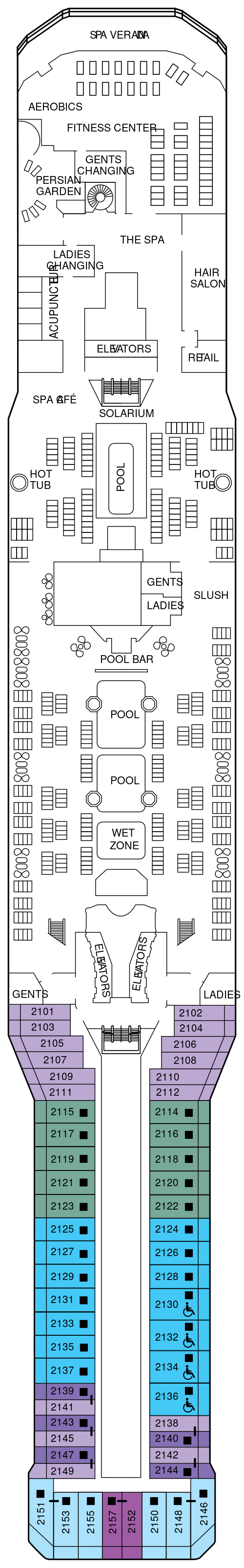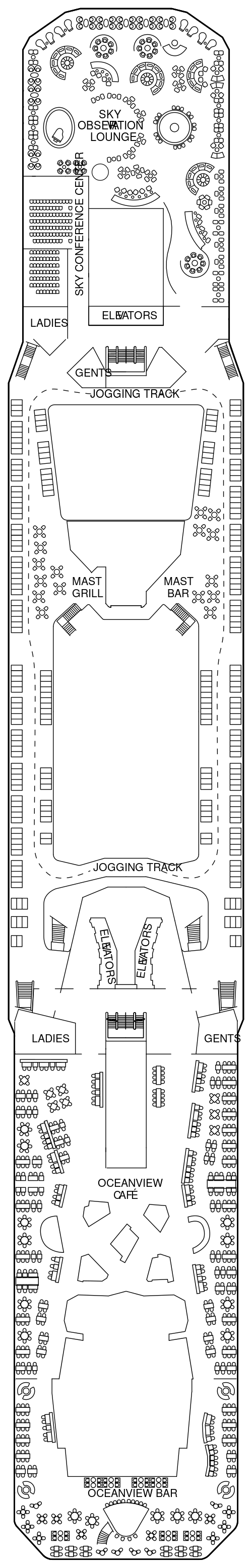12万トンというスケールを活かした、解放感溢れる施設が満載です。本物の天然芝を敷き詰めたオープンデッキ「ローンクラブ」や、世界最大規模のスパなど、日常の喧騒から離れた贅沢な時間をたっぷりとご堪能ください。